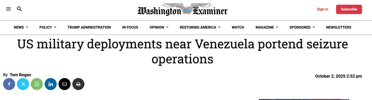 "Действительно, как стало известно изданию Washington Examiner, военные стратеги считают, что собранных сил теперь достаточно для захвата и удержания на территории Венесуэлы ключевых стратегических объектов, таких как порты и аэродромы (издание Washington Examiner не разглашает некоторые подробности по соображениям национальной безопасности). Контроль США над такими объектами позволит увеличить и поддерживать постоянное присутствие американской военной мощи в Венесуэле с обороняемых позиций", - говорится в статье.