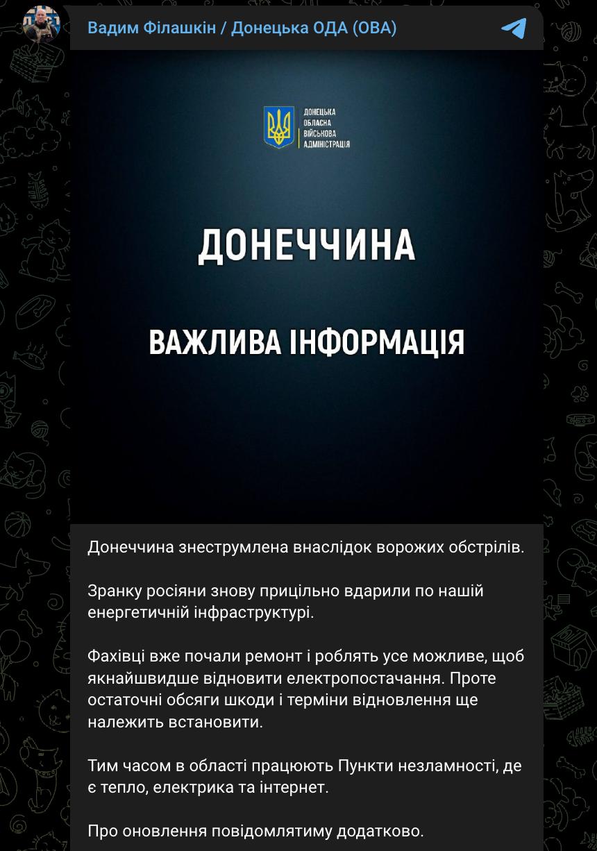8:21 Донецкая область (подконтрольная Украине часть) осталась без света после утреннего удара по энергетике.