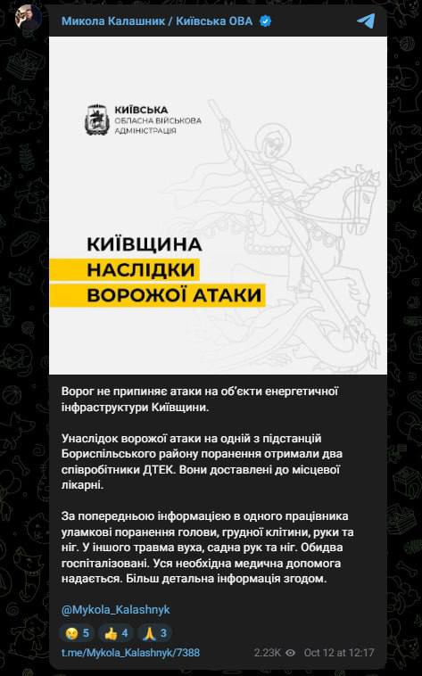 13:28 Россия атаковала подстанции в Бориспольском районе Киева. Ранены два сотрудника ДТЕК.