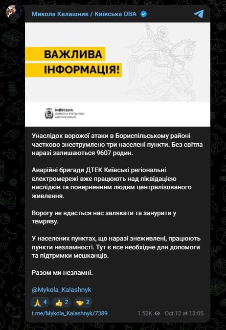 14:26 После ударов по Бориспольскому району частично обесточены три населенных пункта, сообщил глава Киевской ОВА Калашников.