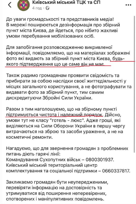 "Изображены фото, которые выдают за сборный пункт города Киева, подтверждения, что это именно он, нет. Также советуем гражданам проявить сознание и убирать за собой последствия своей жизнедеятельности в местах общего пользования, а не фотографировать и выдавать фото за сборный пункт, тем самым дискредитируя ВСУ", - заявляет ТЦК.