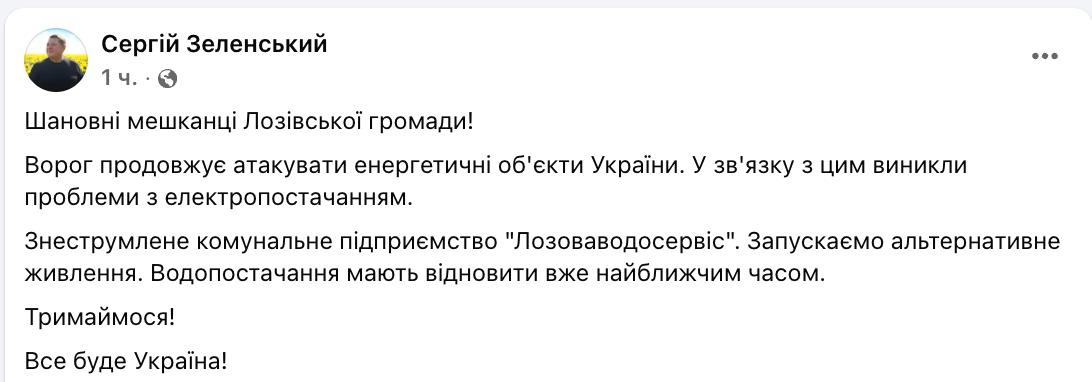 “Обесточено коммунальное предприятие “Лозоваводосервис”. Запускаем альтернативное питание”, - сказал мэр.
