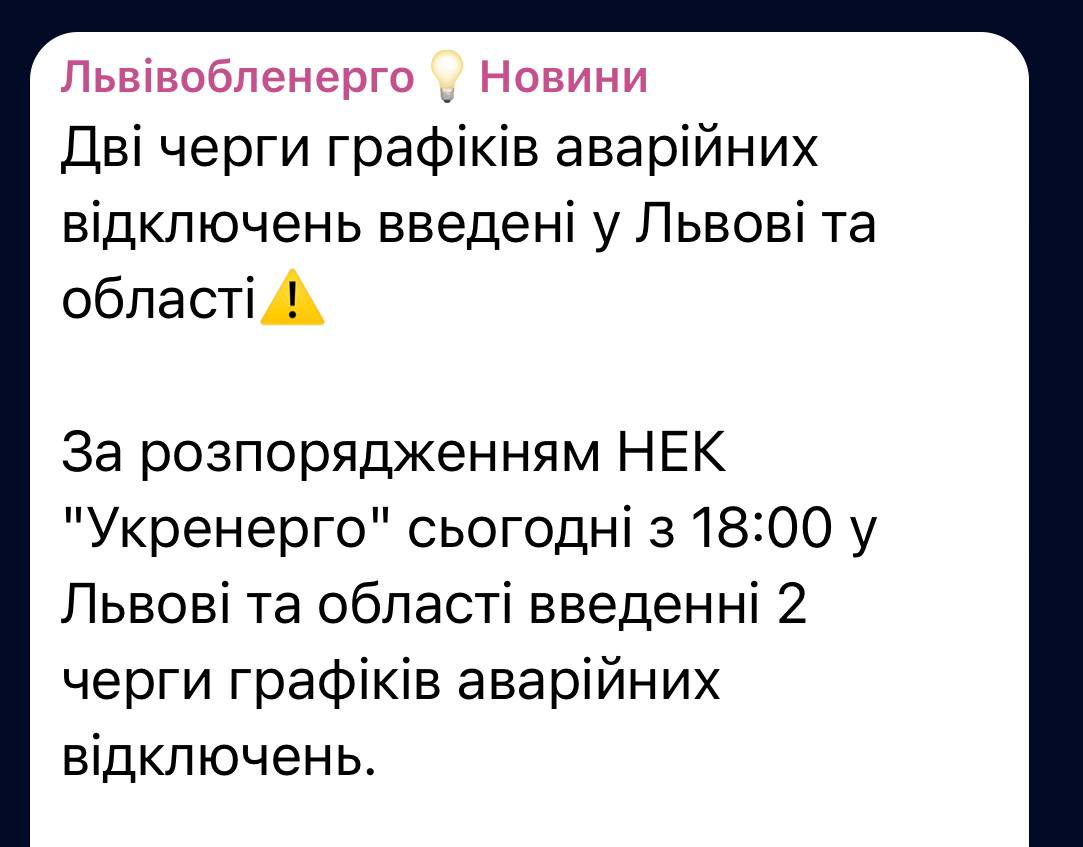 18.13 Во Львовской области также введены экстренные отключения света, сообщает "Львовоблэнерго".
