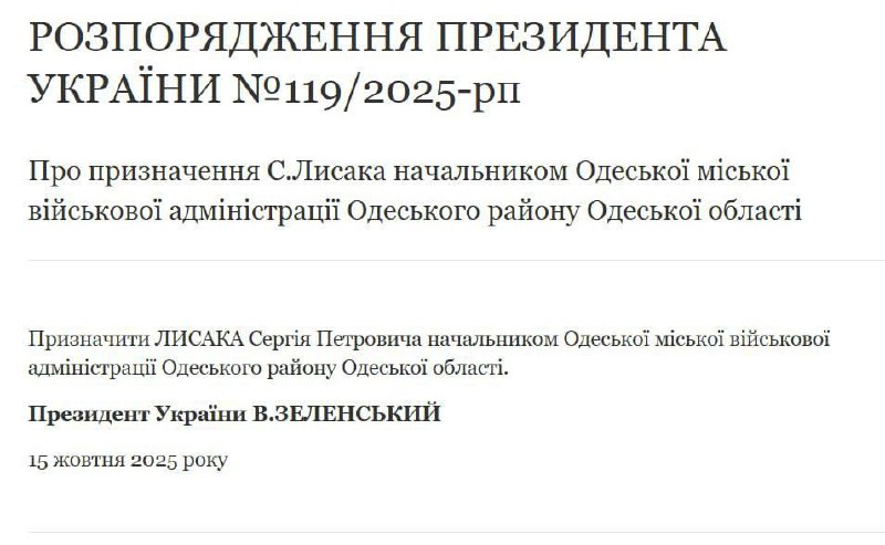 "Назначить Лысака Сергея Петровича начальником Одесской городской военной администрации Одесского района Одесской области. Обязанности главы Днепропетровской ОВА будет временно исполнять заместитель Владислав Гайваненко", - сказано в документе.