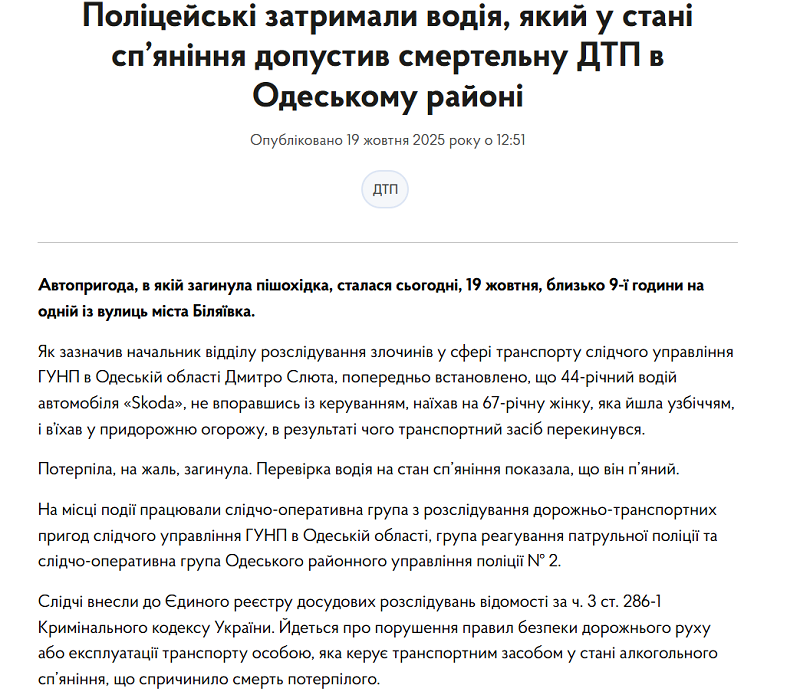 Следователи внесли сведения в Единый реестр досудебных расследований по ч. 3 ст. 286-1 Уголовного кодекса Украины – нарушение правил дорожного движения или эксплуатации транспорта в состоянии алкогольного опьянения, что привело к гибели человека.