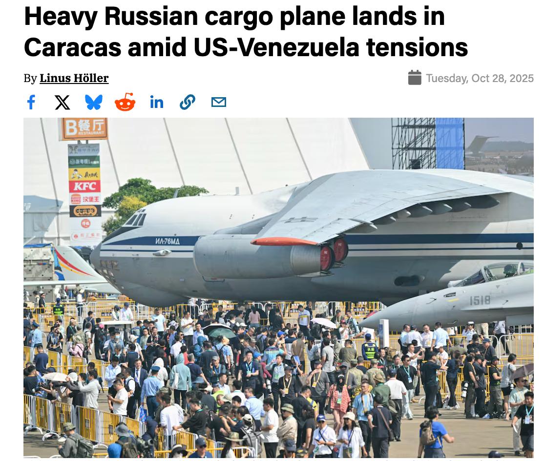 Российский транспортный самолёт Ил-76 приземлился в Каракасе на фоне слухов о вероятной атаке США на Венесуэлу.