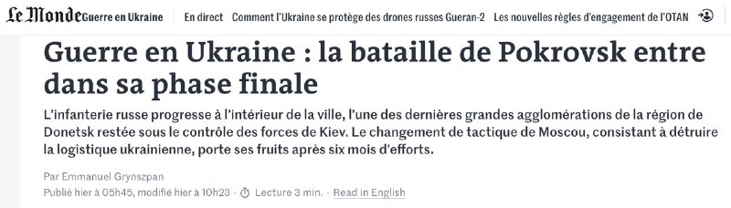 Ситуации в Покровске посвятило материал еще одно западное издание Le Monde. В интервью газете украинский офицер мотострелковой бригады, находящейся в городе более года, заявил, что падение Покровска - вопрос "дней, максимум двух недель".