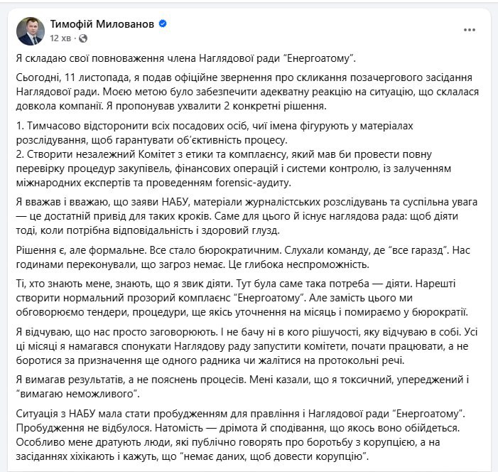 Бывший министр экономики Украины Тимофей Милованов заявил о выходе из наблюдательного совета "Энергоатома" после скандала с делом бизнесмена Тимура Миндича о коррупции в энергосфере.