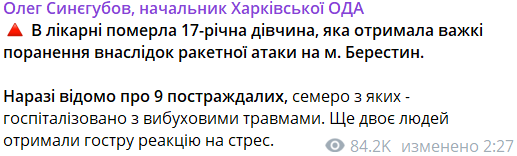 По информации Харьковской областной прокуратуры, российские войска сначала обстреляли город Берестин двумя ракетами, а затем повторно атаковали его ещё двумя.