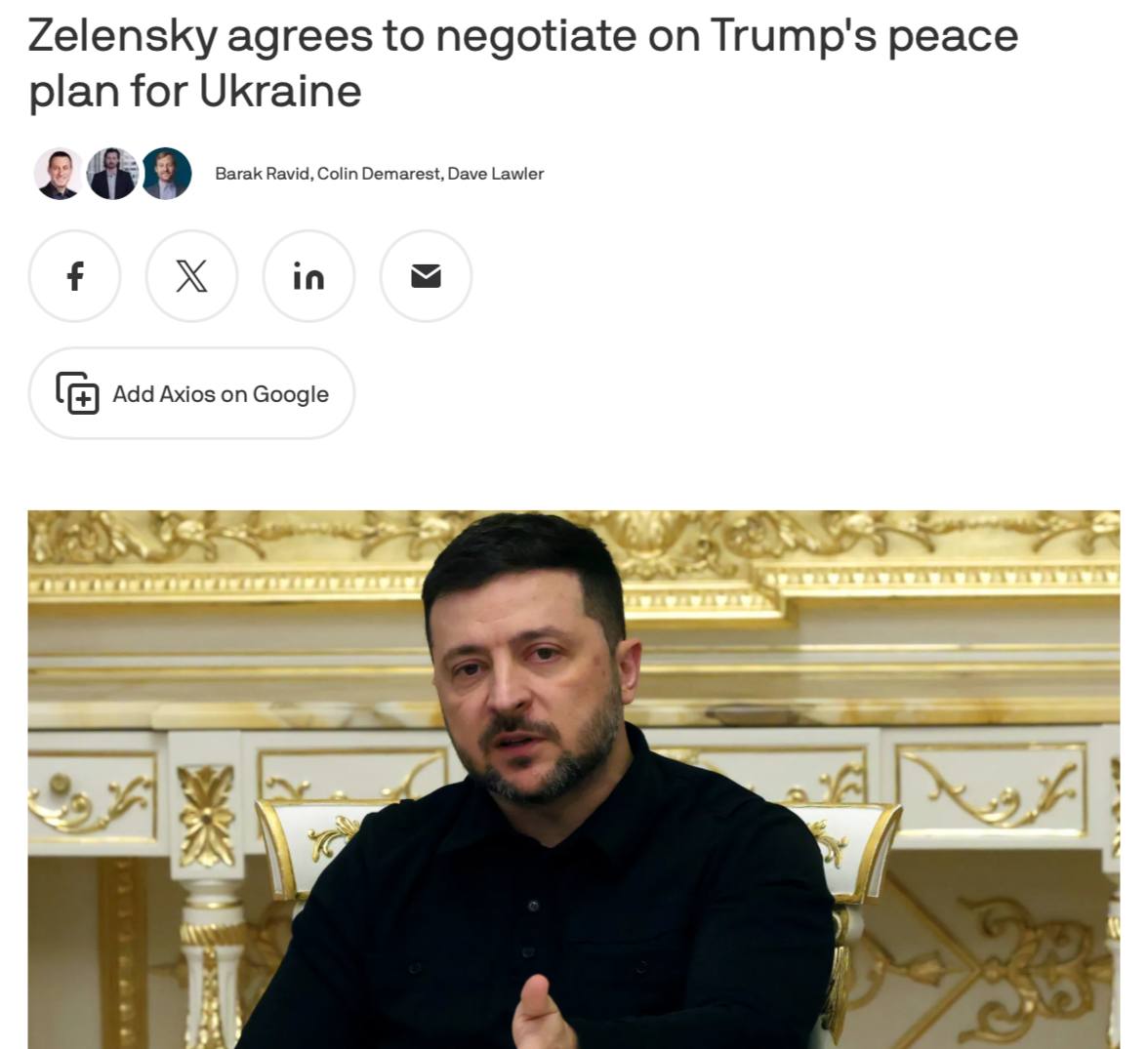 "Зеленский получил сигналы от США о том, что ему следует принять соглашение, разработанное в консультации с Москвой, сообщил источник, знакомый с ситуацией, пожелавший остаться анонимным в связи с деликатным характером вопроса. Президент Дональд Трамп поддерживает этот план, сообщил высокопоставленный американский чиновник", – говорится в публикации.