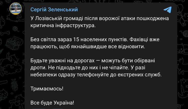 08:48 После удара по Лозовой Харьковской области 15 населенных пунктов района остались без света. Об этом сообщил мэр города Сергей Зеленский.
