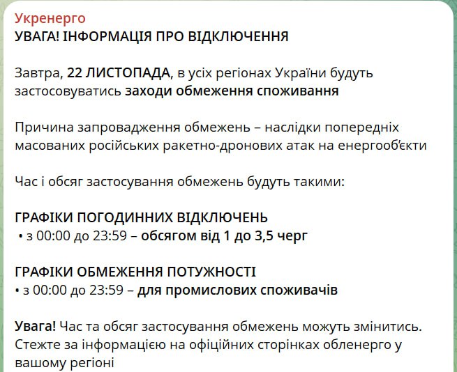 18:12 Отключения света завтра будут во всех регионах – круглосуточно в объеме от 1 до 3,5 очередей, сообщает Укрэнерго.