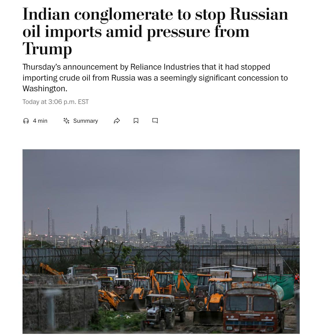 Reliance Industries принадлежит Мукешу Амбани, одному из крупнейших бизнесменов Индии и союзнику премьер-министра Нарендры Моди. Конгломерат был крупнейшим покупателем российской нефти в республике. С начала конфликта в Украине в 2022 году компания приобрела сырья на сумму около $33 млрд, это почти 8% всех экспортных продаж российской нефти.