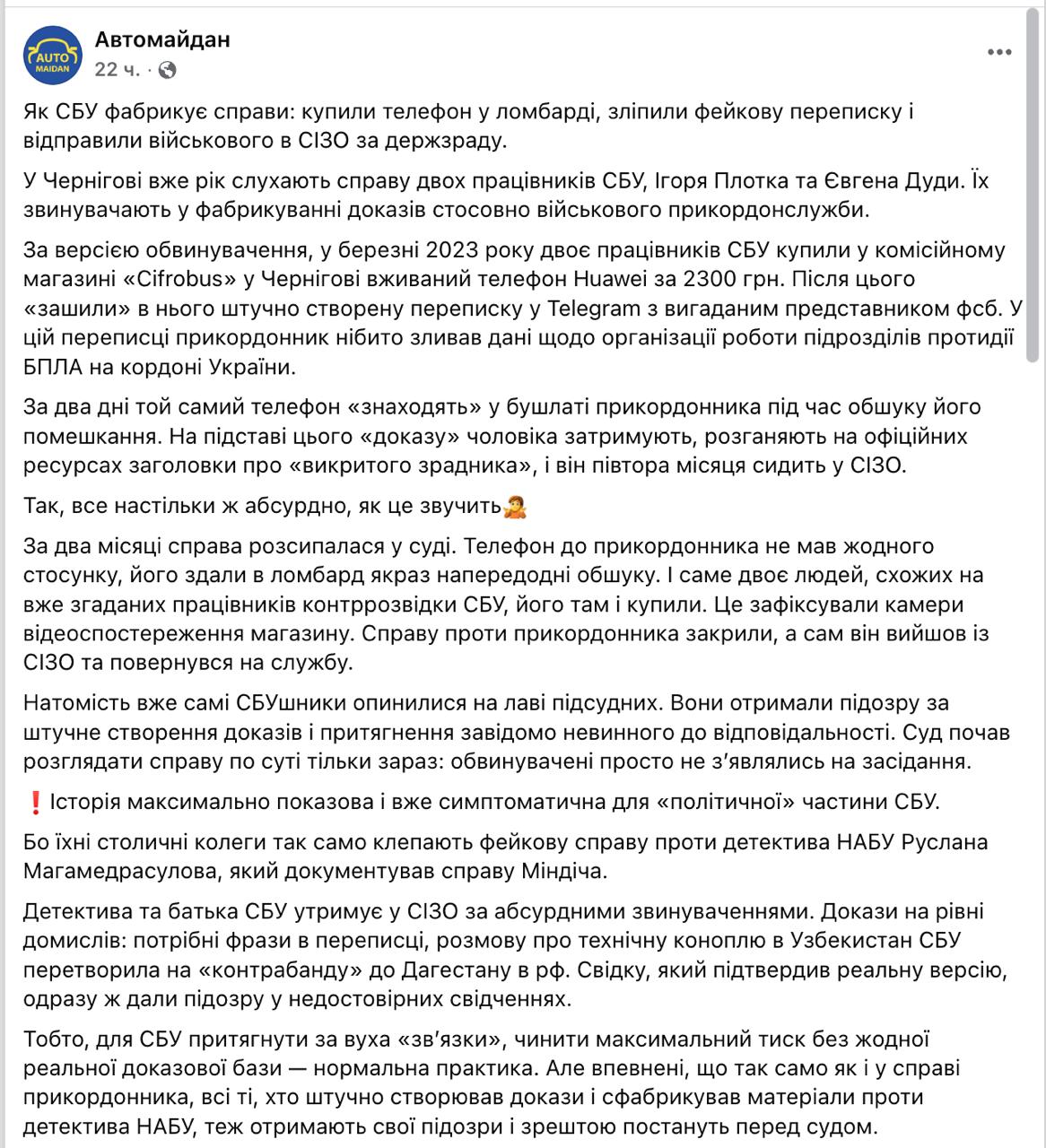 "История максимально показательная и уже симптоматичная для "политической" части СБУ. Их столичные коллеги так же фабрикуют фейковое дело против детектива НАБУ Руслана Магамедрасулова, который документировал дело Миндича" - говорится в сообщении "Автомайдана".