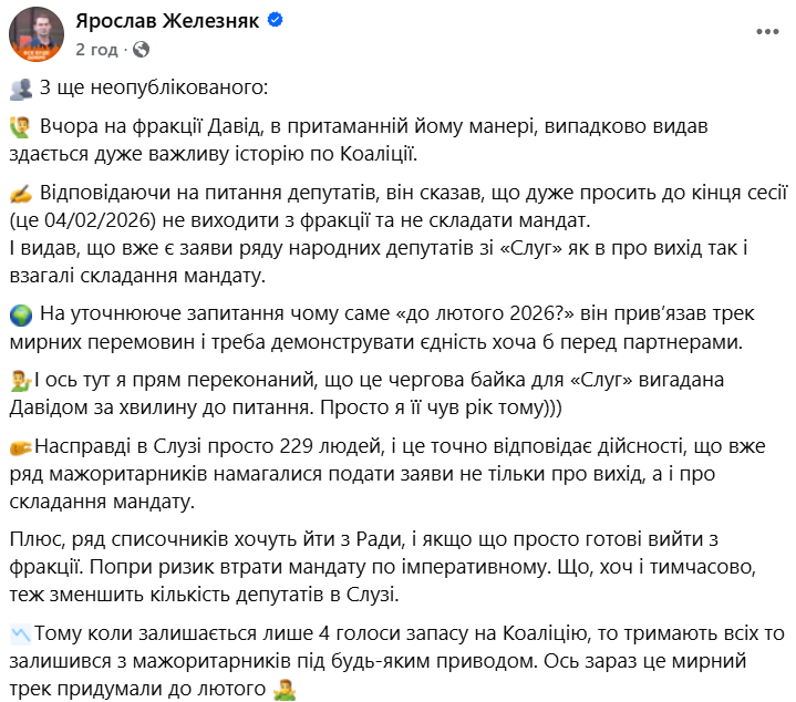 Железняк уверен, что Арахамия пытается избежать потери монобольшинства, в котором осталось 229 депутатов при минимуме в 226. Притом депутаты-списочники, желающие покинуть фракцию, готовы к тому, что придется покинуть и Раду, утверждает нардеп.