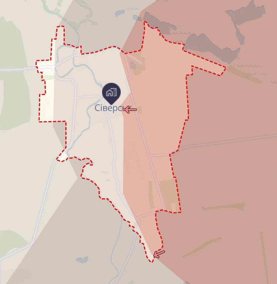На карте DeepState почти весь Северск показан либо под контролем РФ, либо в серой зоне.