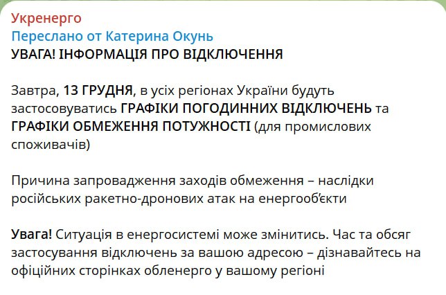 18:07 Графики отключений завтра будут действовать по всей стране, сообщает Укрэнерго.