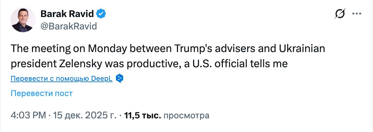 16.32 Сегодняшняя встреча Уиткоффа с Зеленским была продуктивной, пишет журналист Axios Барак Равид со ссылкой на американского чиновника.