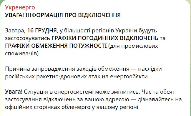19.14 Свет завтра будут отключать не во всех областях, сообщает Укрэнерго.