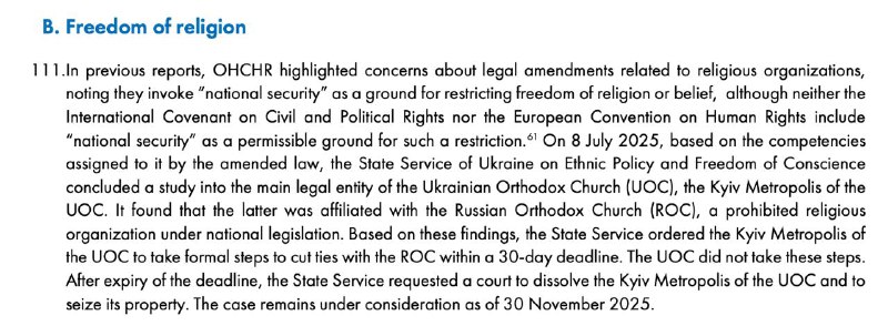 Также в ООН осудили закон, открывающий дорогу к запрету УПЦ. В документе отмечается, что церковь нельзя преследовать только на основании исторической связи с РФ.