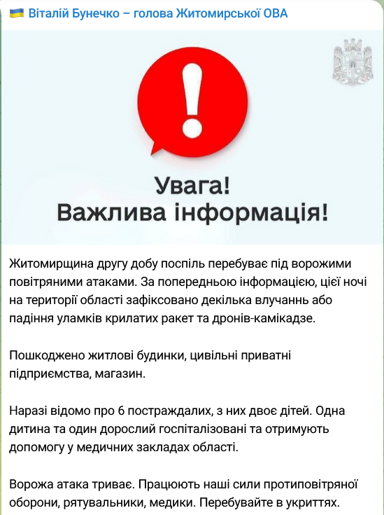 Между тем в Житомирской области зафиксированы несколько попаданий ракет и дронов. Об этом сообщил глава ОВА Виталий Бунечко.