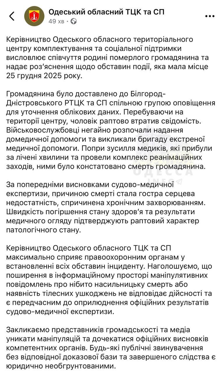 В ТЦК также отмечают, что признаков насильственной смерти не выявлено, и призывают дождаться официальных выводов следствия.