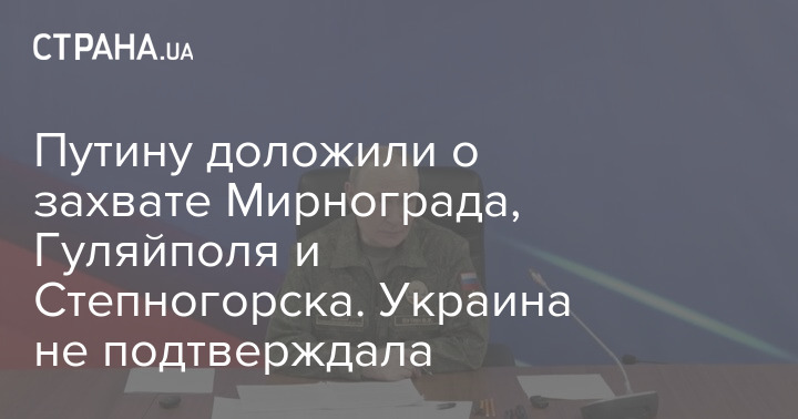 Командование российской армии доложило президенту РФ Владимиру Путину о захвате трех населенных пунктов в Украине. Речь идёт о городах Мирнограде Донецкой области, Гуляйполе и Степногорске Запорожской области.