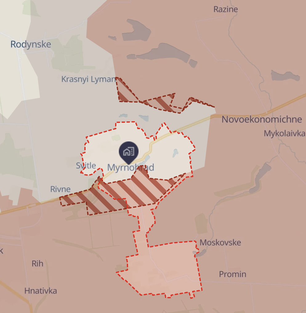 Он сообщил, что за последние недели россиянам удалось удержать и расширить плацдарм западнее реки Казенный Торец, усилить давление на север Мирнограда и продвинуться малыми пехотными группами в пригородах. Отдельные подразделения вошли в северные поселки вокруг Мирнограда, частично блокировав украинские силы в его центральной части.