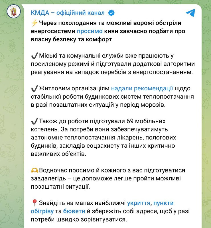 15:22 КГГА призывает жителей Киева заряжать павербанки, готовиться к походам в пункты обогрева и запасаться водой из-за похолодания и возможных обстрелов объектов энергетики. Также предлагается запасаться свечками, одеялами и заранее заклеить окна изоляционными материалами.