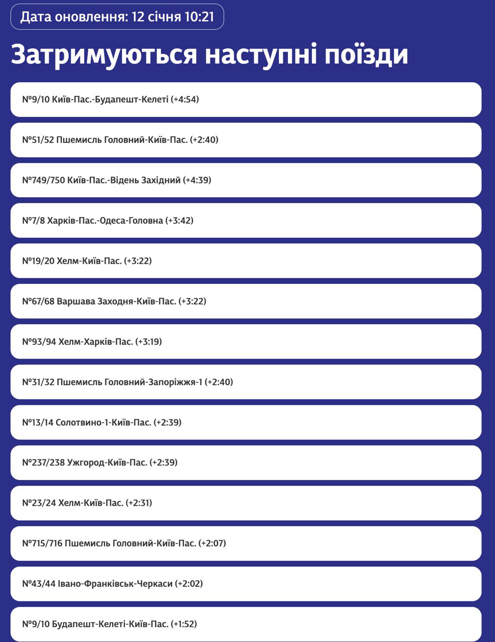 11.20 Несколько поездов задерживается из-за ночного удара РФ по железнодорожной инфраструктуре, сообщает "Укрзализныця".