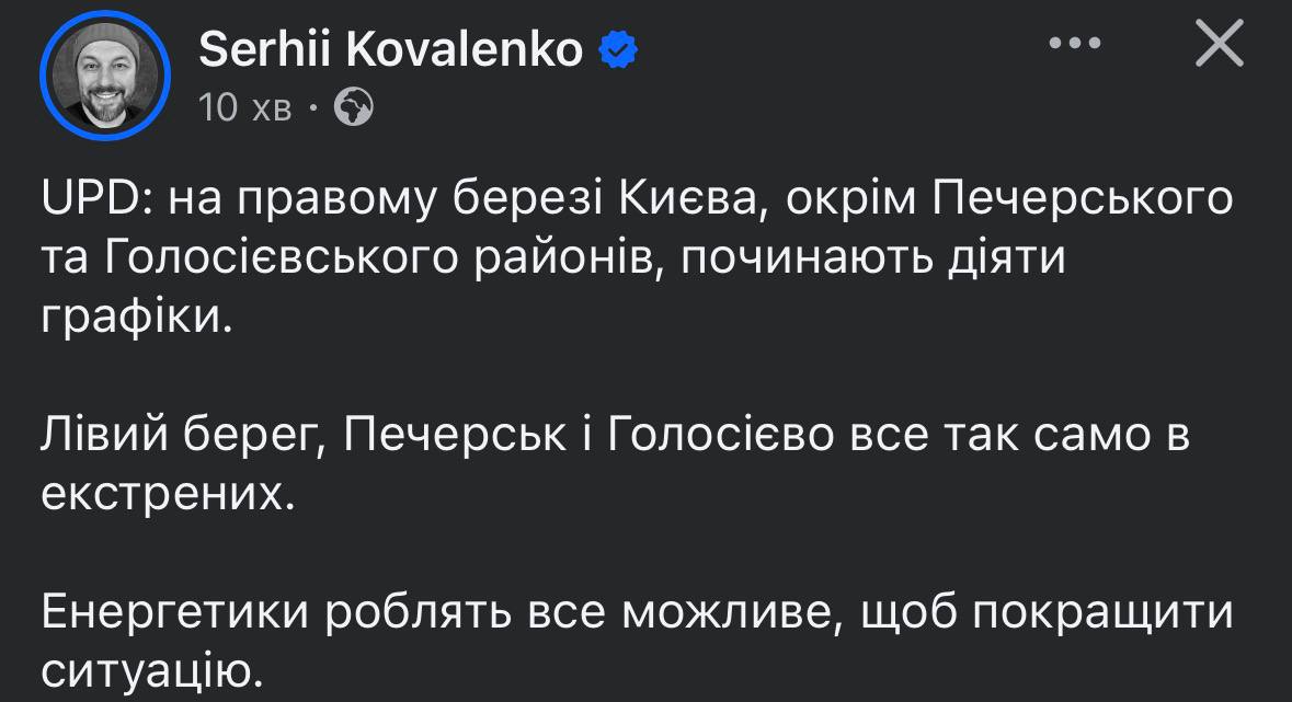 14.16 Кроме Киева экстренные отключения ввели в части Киевской области, сообщает Минэнерго.