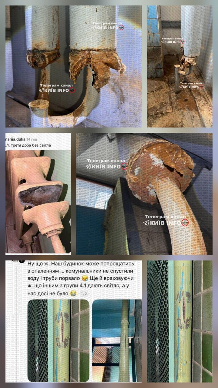 "Лобановского, 37. Разорвало трубы в доме. Аварийка ничего не может сделать. Сварщик не может работать, потому что света нет. А свет нам дают только ночью, на 2-3 часа. Вот такой сюр. Уже купили заглушки, трубы, газовую горелку за свой счет. Но, увы, дубеем дальше", - написала одна из читательниц.