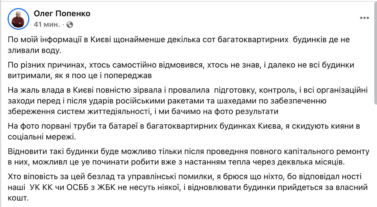 "К сожалению, власти в Киеве полностью сорвали и провалили подготовку, контроль и все организационные мероприятия по обеспечению сохранения систем жизнедеятельности перед ударами и после ударов российскими ракетами и дронами, и мы видим результаты. Восстановить такие дома будет возможно только после проведения полного капитального ремонта в них. Это можно начинать делать уже с наступлением тепла через несколько месяцев", - написал он.