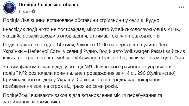 В поселке Рудно недалеко от Львова неизвестный стрелял в автомобиль сотрудников территориального центра комплектования (ТЦК).