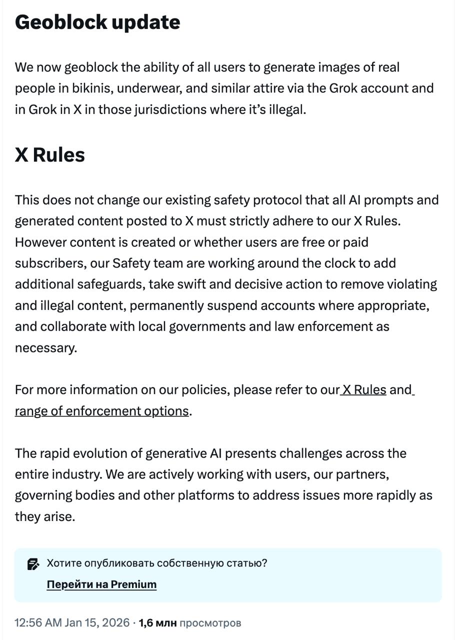 "Мы приняли меры, чтобы Grok не позволял редактировать изображения реальных людей и изображать их в откровенной одежде, такой как бикини. Теперь мы геоблокируем возможность для всех пользователей создавать изображения реальных людей в бикини, нижнем белье и аналогичной одежде через аккаунт Grok и Grok в X в тех юрисдикциях, где это незаконно. Это ограничение распространяется на всех пользователей, включая платных подписчиков", — говорится в заявлении.