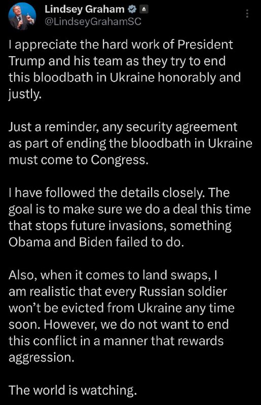 "Когда речь идет о территориальных обменах, я реалист и понимаю, что каждого российского солдата не удастся выставить с территории Украины в ближайшее время. Однако мы не хотим завершать этот конфликт таким образом, который вознаграждает агрессию", - написал Грэм.