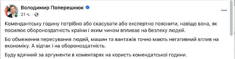 "Комендантский час нужно либо отменить, либо экспертно объяснить, зачем он нужен, как усиливает обороноспособность страны и каким образом влияет на безопасность людей. Потому что ограничение передвижения людей, машин и грузов точно оказывает негативное влияние на экономику. А следовательно, и на обороноспособность", - написал Поперешнюк.