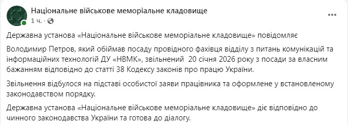 "Владимир Петров, занимавший должность ведущего специалиста отдела по вопросам коммуникаций и информационных технологий ГУ "НВМК", уволен 20 января 2026 года с должности по собственному желанию в соответствии со статьей 38 Кодекса законов о труде Украины. Увольнение произошло на основании личного заявления работника и оформлено в установленном законодательством порядке", - сказано в публикации.