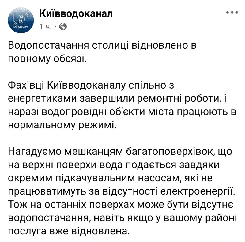 08:25 В Киеве вернули водоснабжение, которое пропадало после вчерашних ударов. Об этом сообщает городской водоканал.
