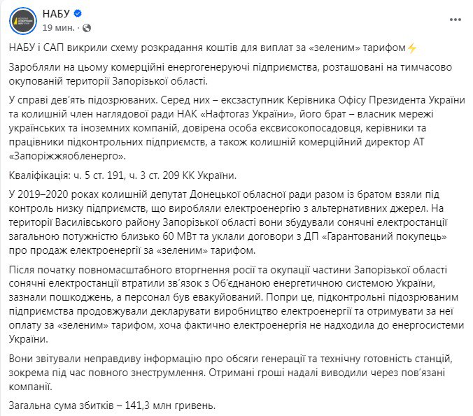 НАБУ удалось разоблачить схему хищения коммерческими энергогенерирующими предприятиями средств на "зеленом" тарифе. Предприятия были расположены в захваченной РФ части Запорожской области.