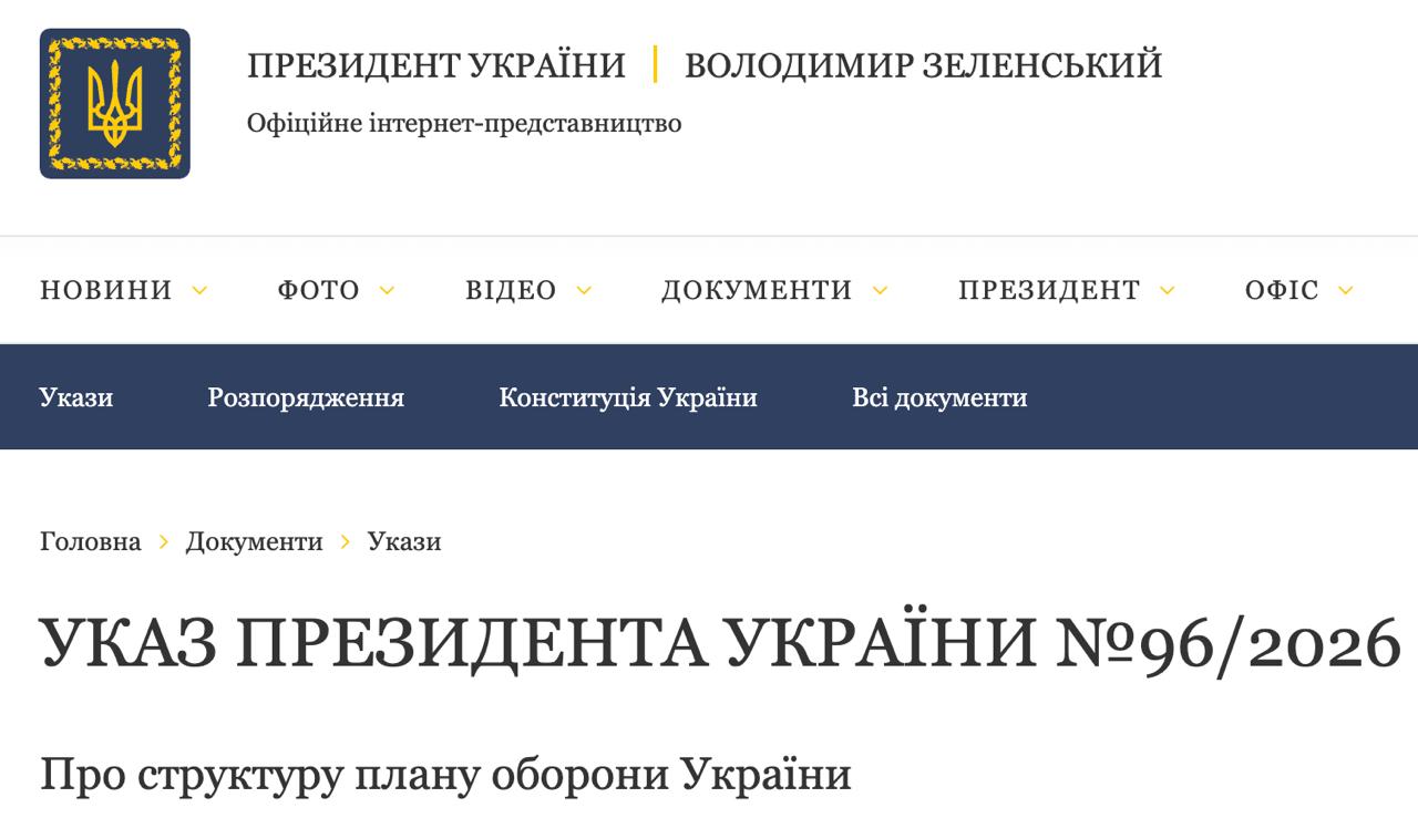 Об этом говорится в указе №96/2026 о структуре плана обороны Украины, опубликованном на сайте главы государства.