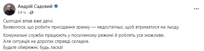 "Сегодня упал уже дважды. Оказалось, что делать приседания с утра недостаточно, чтобы удержаться на льду. Коммунальные службы работают в усиленном режиме и делают все возможное. Но ситуация на дорогах действительно сложная. Будьте осторожны, пожалуйста!" - сказано в его публикации на Фейсбуке.
