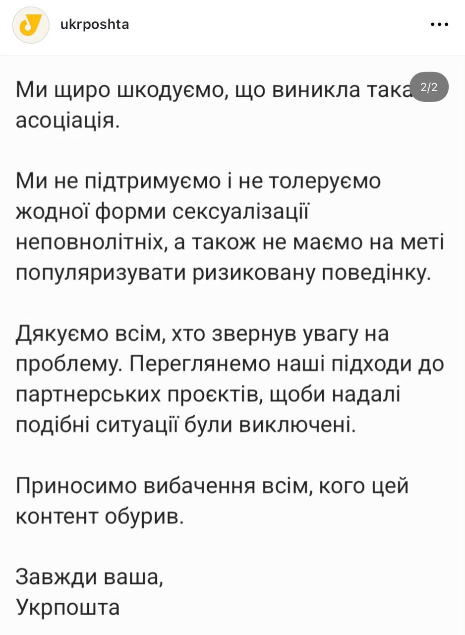 "Часть нашей команды помнит школьные годы 2000-х - с мини-юбками, джинсами-скинни и духом подросткового бунта. Задумка фотосессии апеллировала к этим воспоминаниям. Однако мы не учли, как это может выглядеть сейчас - особенно с учетом чувствительности к теме сексуализации детей", - говорится в заявлении "Укрпочты".
