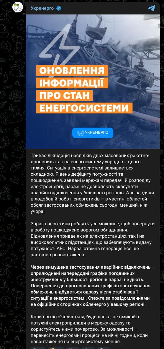 "Уровень дефицита мощности и повреждения, нанесенные сетям передачи и распределения электроэнергии, в настоящее время не позволяют отменить аварийные отключения в большинстве регионов", - добавили в компании.