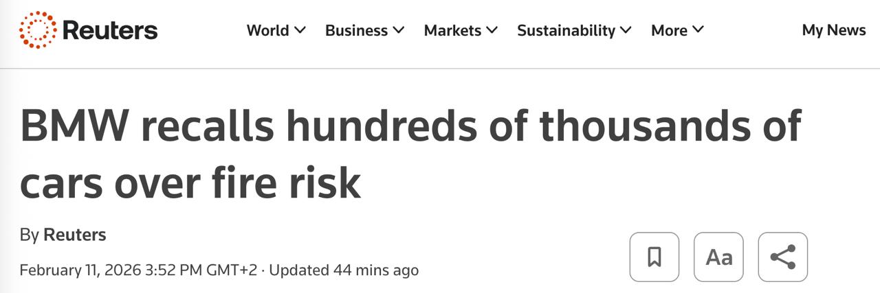 Немецкая автомобилестроительная компания BMW отзывает около 575 тысяч автомобилей разных моделей по всему миру из-за угрозы возгорания. Из них почти 28,6 тысячи - в Германии.