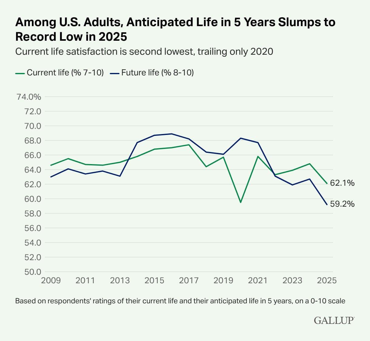 По данным опроса, доля взрослых американцев, считающих, что их жизнь в следующие пять лет будет благополучной, в 2025 году составила 59,2%, что стало самым низким показателем за почти два десятилетия.
