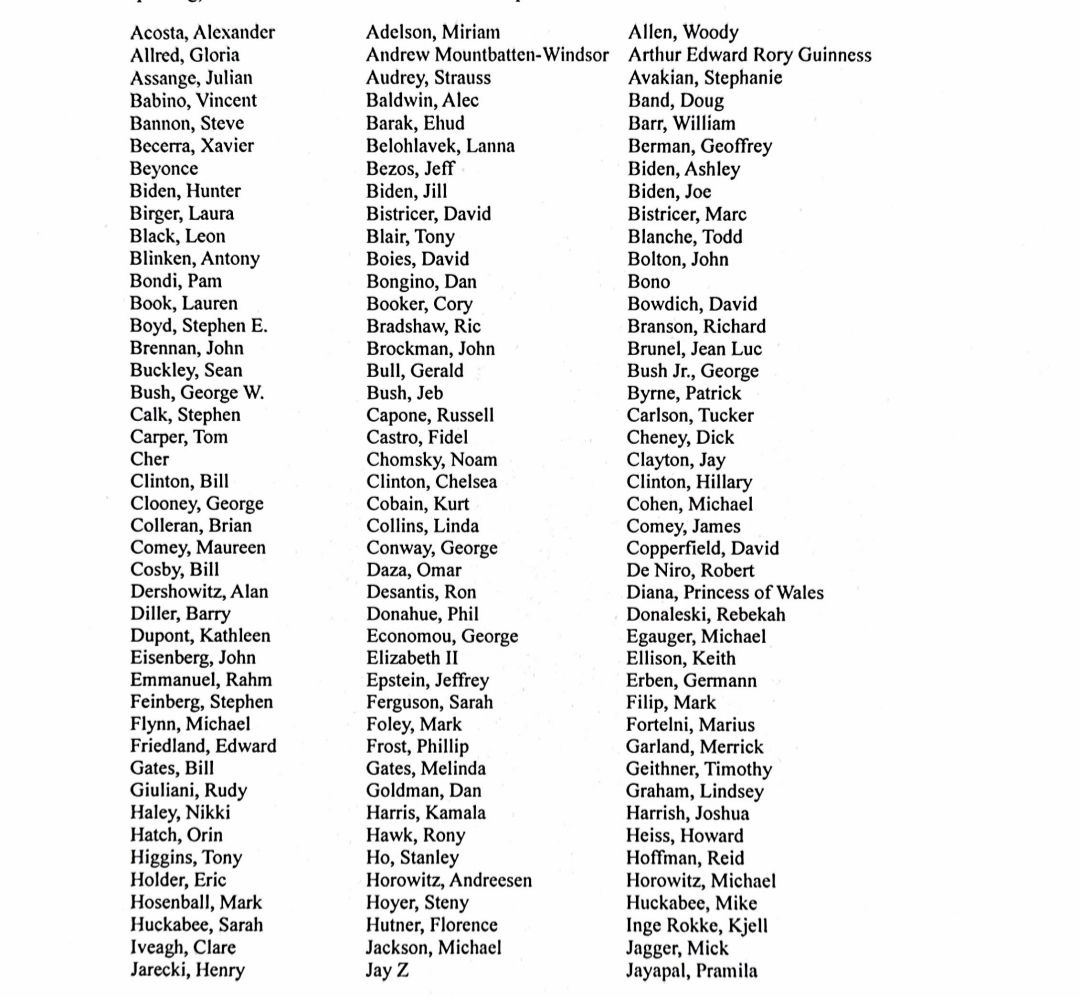 Среди фигурантов списка - Дональд Трамп, Барак и Мишель Обама, принц Гарри, Билл Гейтс, Вуди Аллен, Ким Кардашьян, Курт Кобейн, Марк Цукерберг и Брюс Спрингстин. В списке более 300 человек - это те, кто являлись или являются государственными должностными лицами либо публичными персонами и чьи имена как минимум один раз встречаются в материалах.