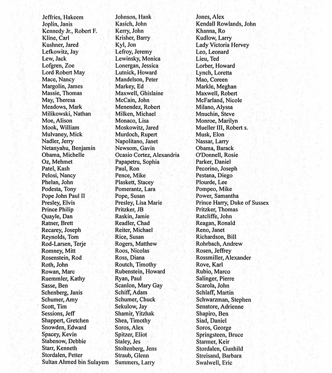 Министерство юстиции уточняет, что имена фигурируют "в широком разнообразии контекстов": от прямой переписки с Эпштейном или его подельницей Гислейн Максвелл, которая недавно отказалась отвечать на вопросы  членов палаты представителей США в рамках расследования дела, связанного с преступлениями покойного финансиста, до упоминаний в документах, не связанных напрямую с преступной деятельностью.
