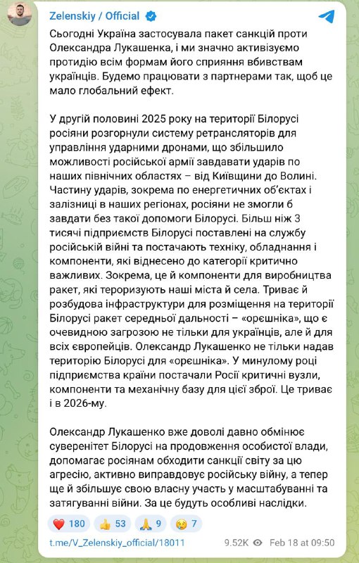 "Александр Лукашенко уже давно обменивает суверенитет Беларуси на продолжение личной власти, помогает россиянам обходить санкции мира за эту агрессию, активно оправдывает российскую войну, а теперь еще и увеличивает свое участие в масштабировании и затягивании войны. За это будут особые последствия", - предупредил президент Украины.