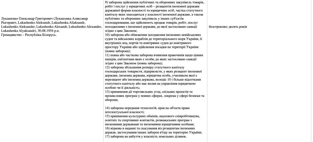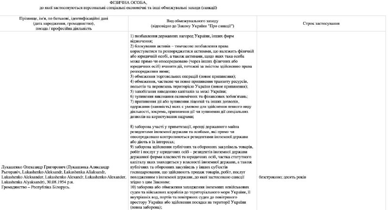 Санкции против Лукашенко предусматривают блокирование активов, прекращение торговли и транзита, запрет финансовых операций, участия в приватизации и аренде государственной собственности, госзакупках, оборонных закупках, операций с ценными бумагами, передачи технологий, въезда в Украину, а также захода судов в украинские порты.